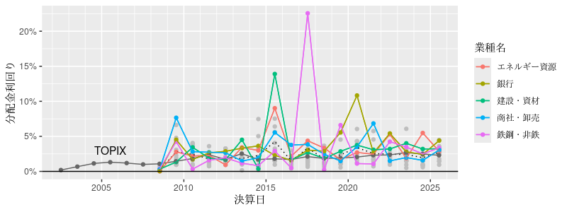 下表は「TOPIX-17」シリーズの各業種の分配金利回りの記述統計です。「TOIPX」ETFの過去17年の分配金利回りの平均が年1.7%であるのに対して、5業種では平均利回りで年3%を超えています。その業種は「エネルギー資源」、「建設・資材」、「鉄鋼・非鉄」、「商社・卸売」、及び「銀行」です。分配金収入(インカム・ゲイン)を目的にした資産運用にはこの5業種のETFが良さそうです。